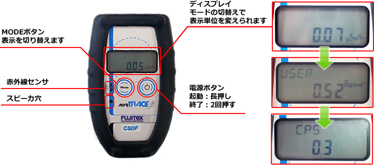 ※本機種はBq/kg(食品内部などの放射能)は表示できません。
